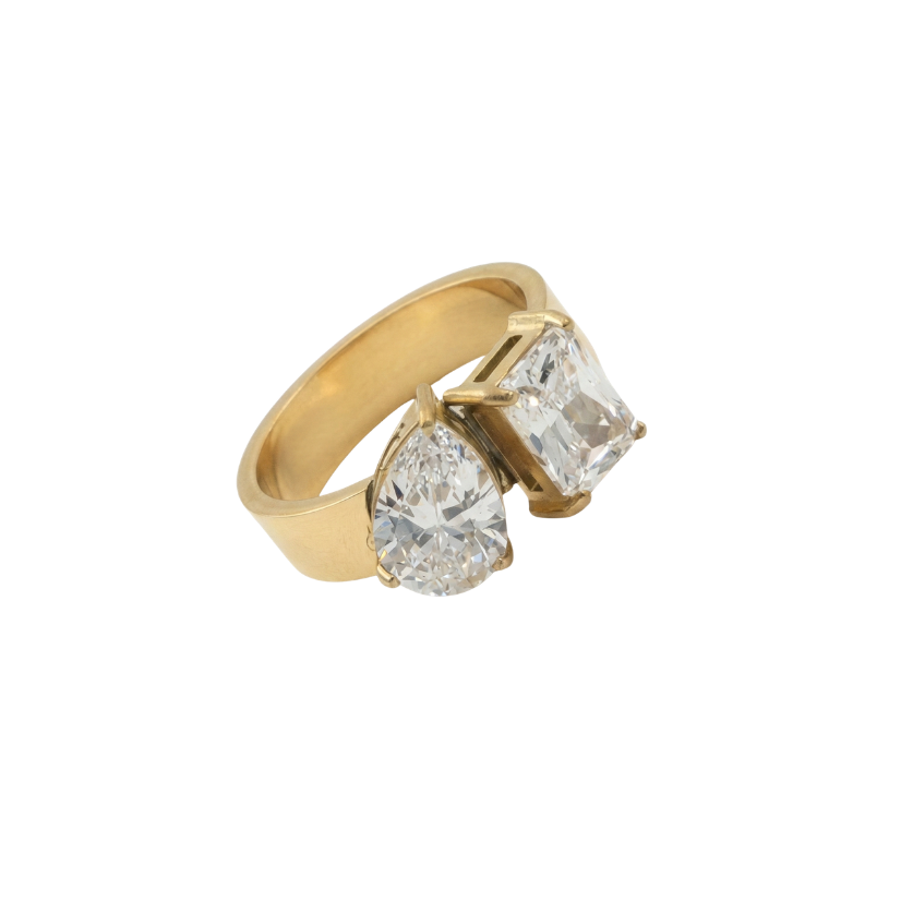 This statement ring features a thick stainless steel band set with two side-by-side diamonds—subtle sparkle meets striking structure. Waterproof and completely tarnish-free, it's made to withstand your day-to-day while adding a polished edge to every look. Wear it solo or stacked—either way, it speaks volumes.