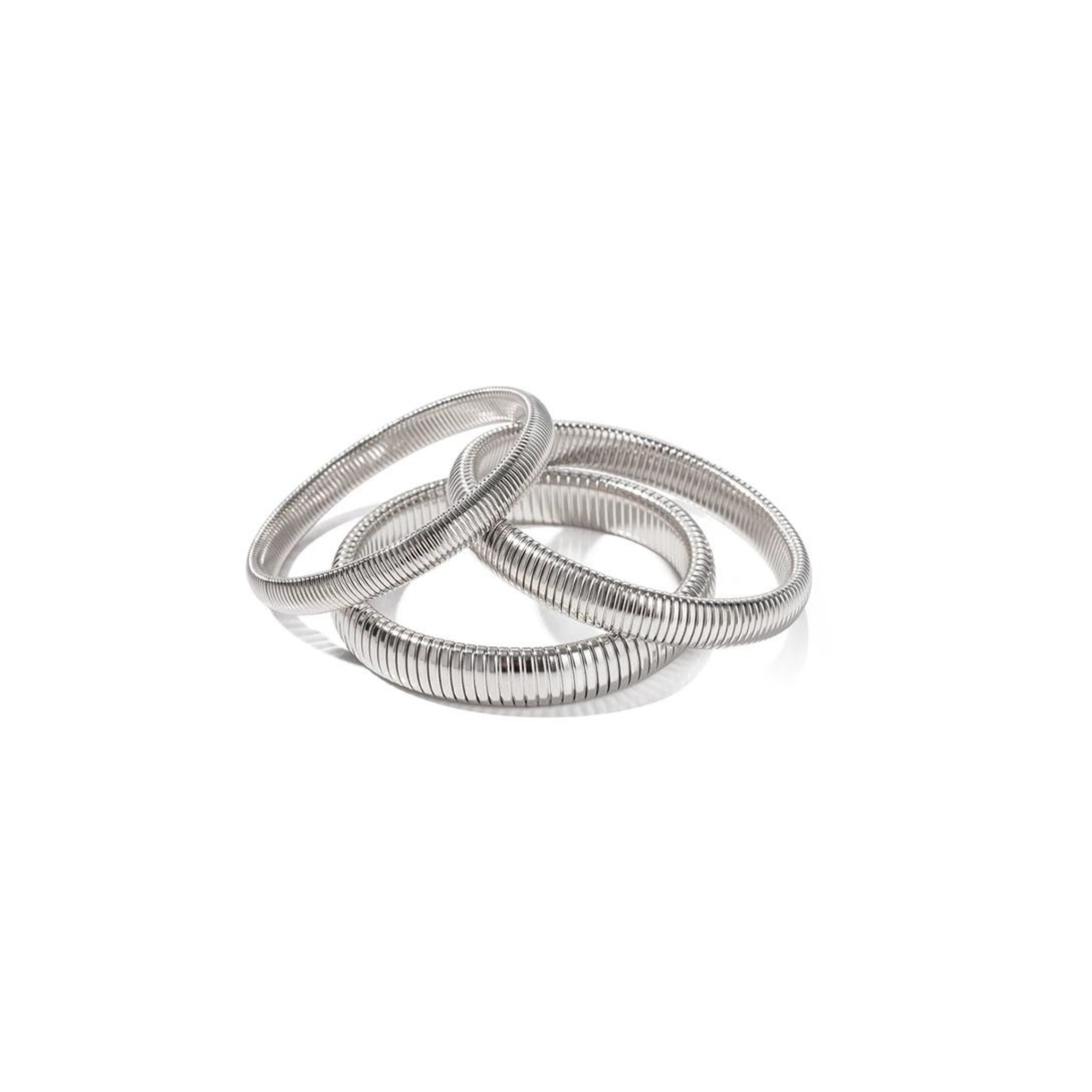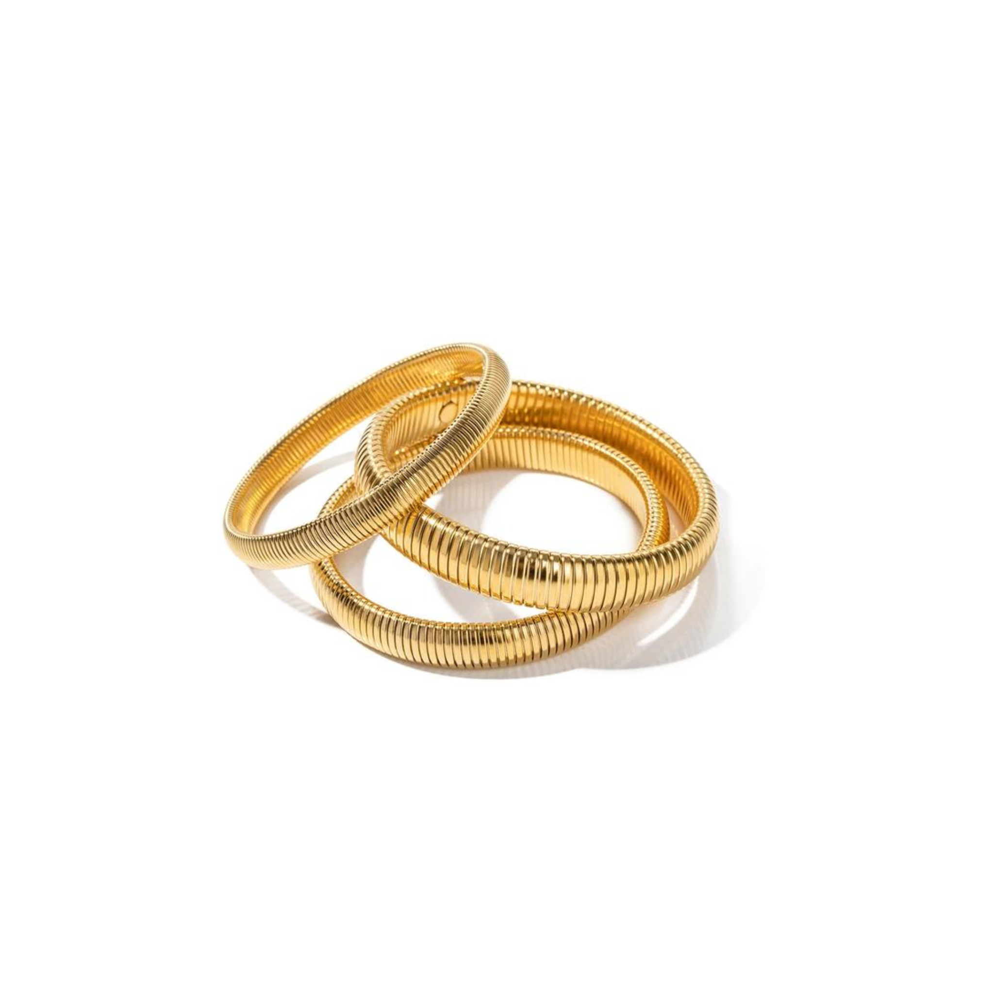 These bracelets are a classic take on the vintage bracelet stack that we all love so much. This style comes in three different widths (8mm, 10mm, 12mm). This set is available in Gold and Silver. These are full stainless steel and tarnish proof.