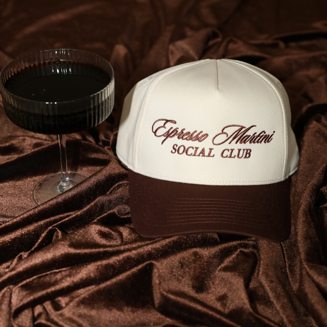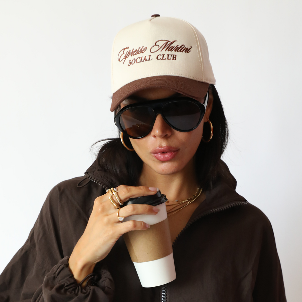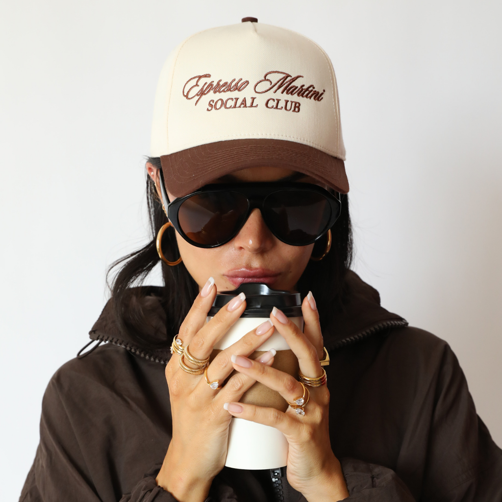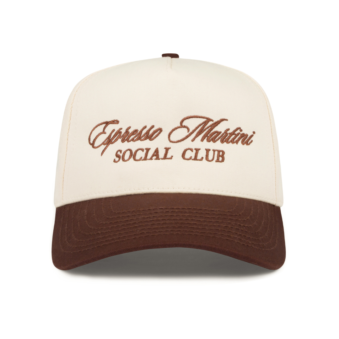 The Espresso Martini Hat is a structured cotton snapback available in two colorways: a two-tone cream and brown design or an all-brown rope version. Finished with brown embroidery and a matching rope detail, it offers a sharp, minimal look with a fully adjustable fit for head sizes up to 7 5/8.