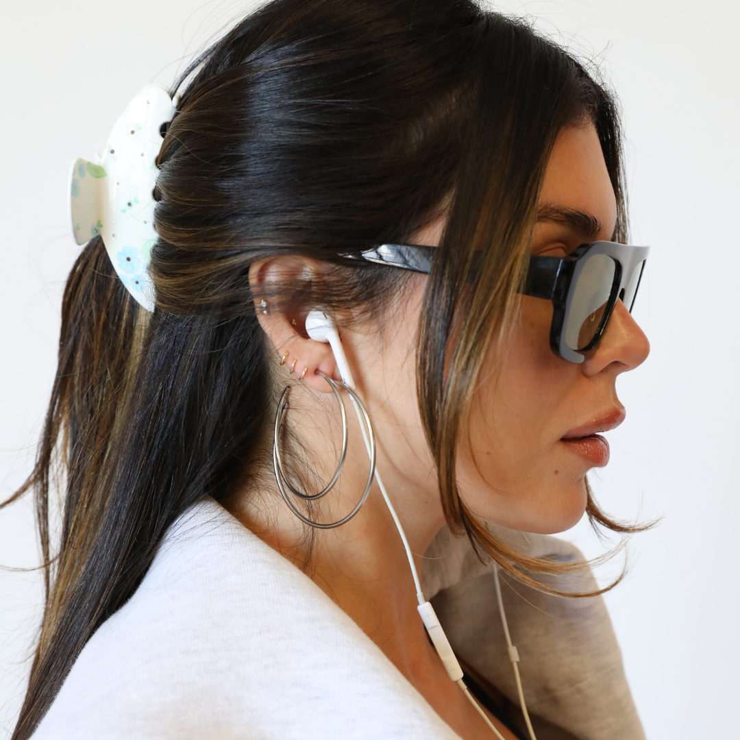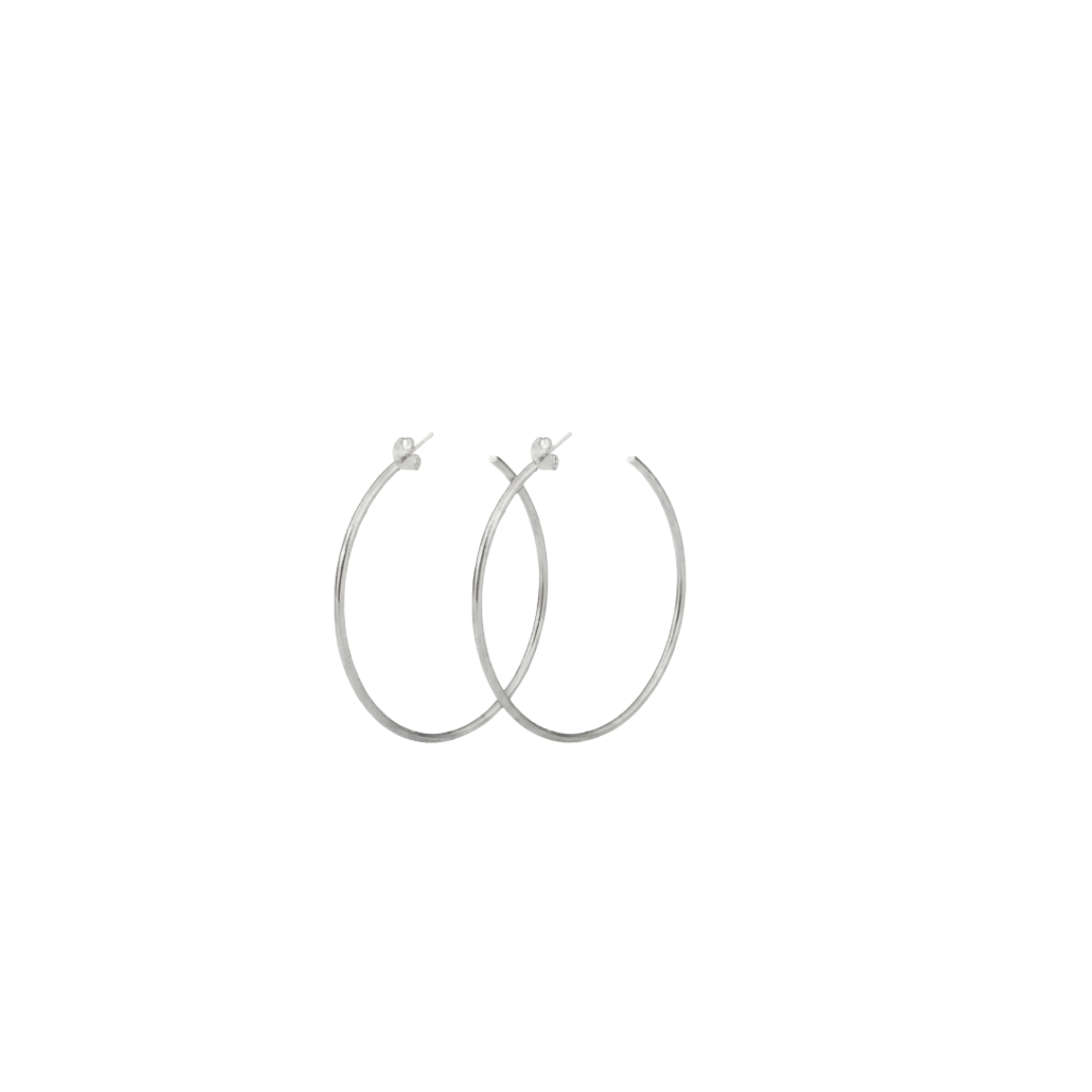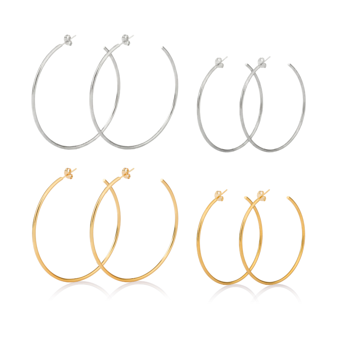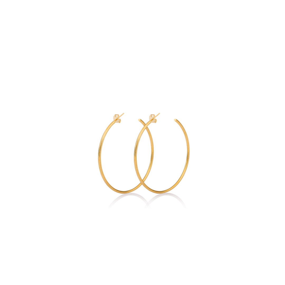 Available in gold and silver and sized at 50mm and 60mm, these hoops frame the face perfectly — subtle enough for everyday, sexy enough for nights out. Made to move with you, sweat with you, swim with you, and never lose their shine.