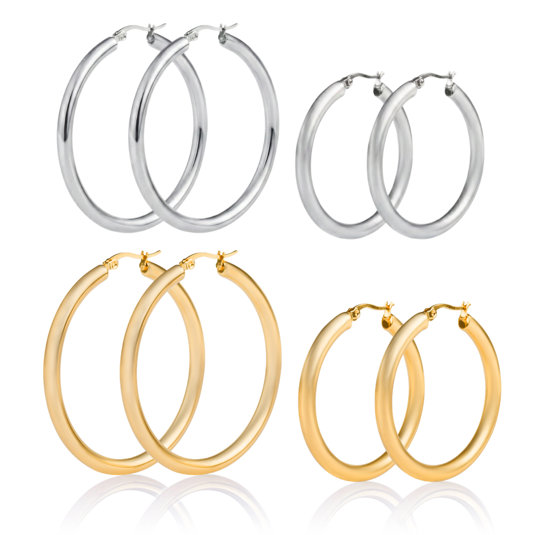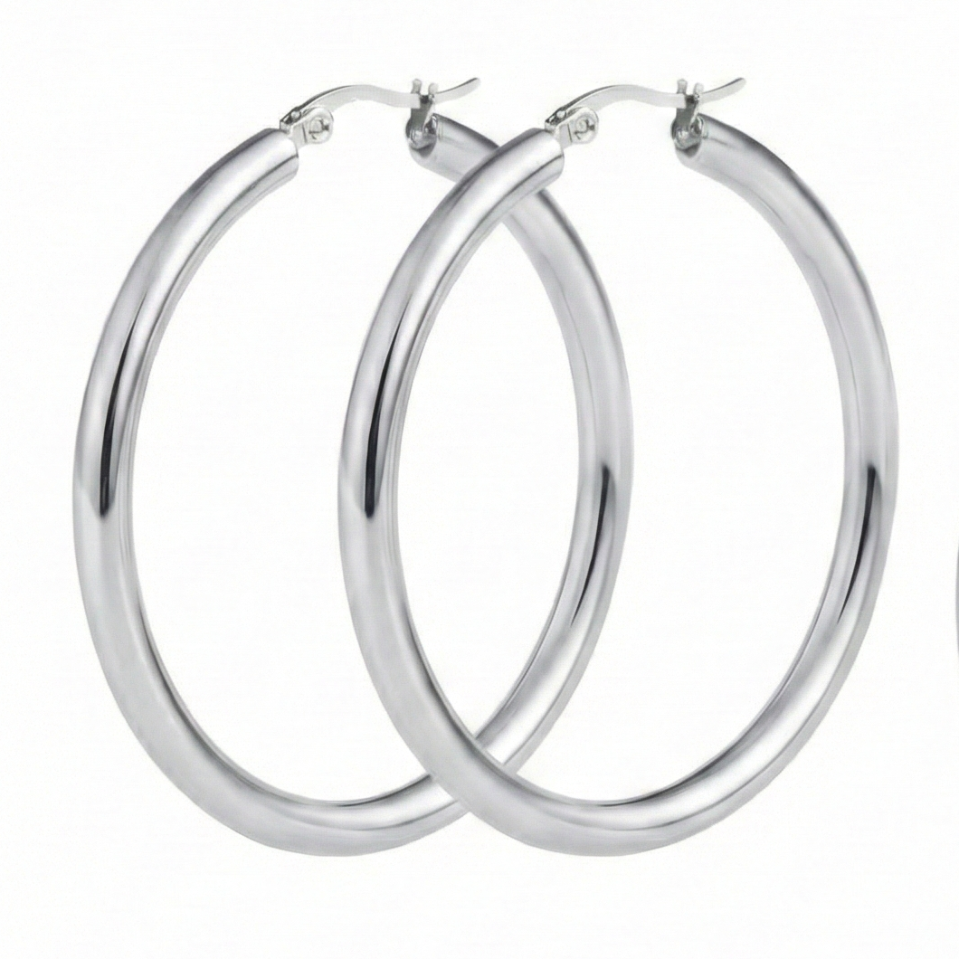 Classic gold & silver hoops available in 40mm and 50mm sizes. Lightweight, everyday wear pieces designed to hold their shine — tarnish-free, waterproof, and hypoallergenic. Finished with a smooth, polished surface and secure latch closure.