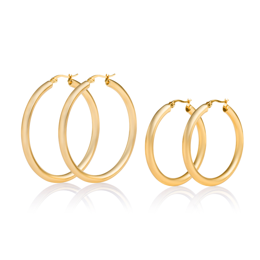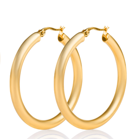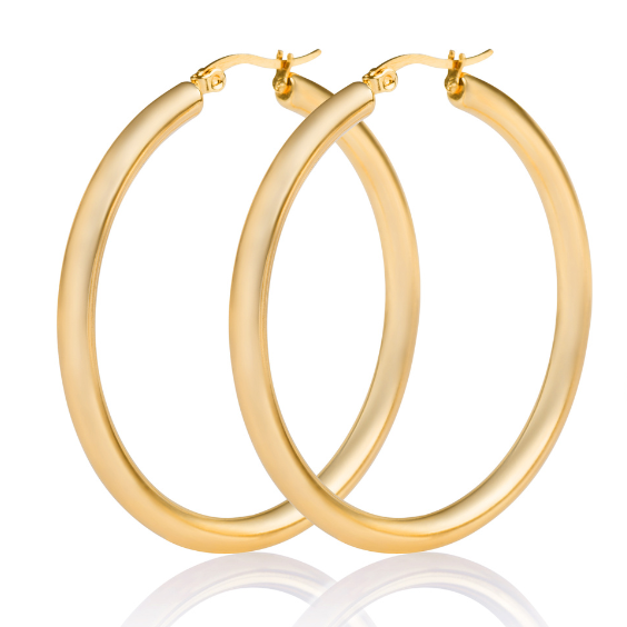 Classic gold hoops available in 40mm and 50mm sizes. Lightweight, everyday wear pieces designed to hold their shine — tarnish-free, waterproof, and hypoallergenic. Finished with a smooth, polished surface and secure latch closure.