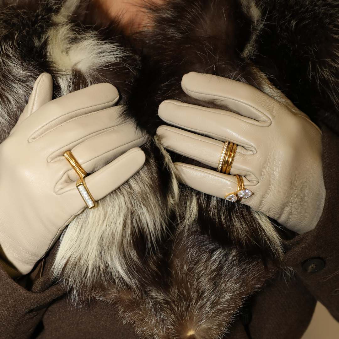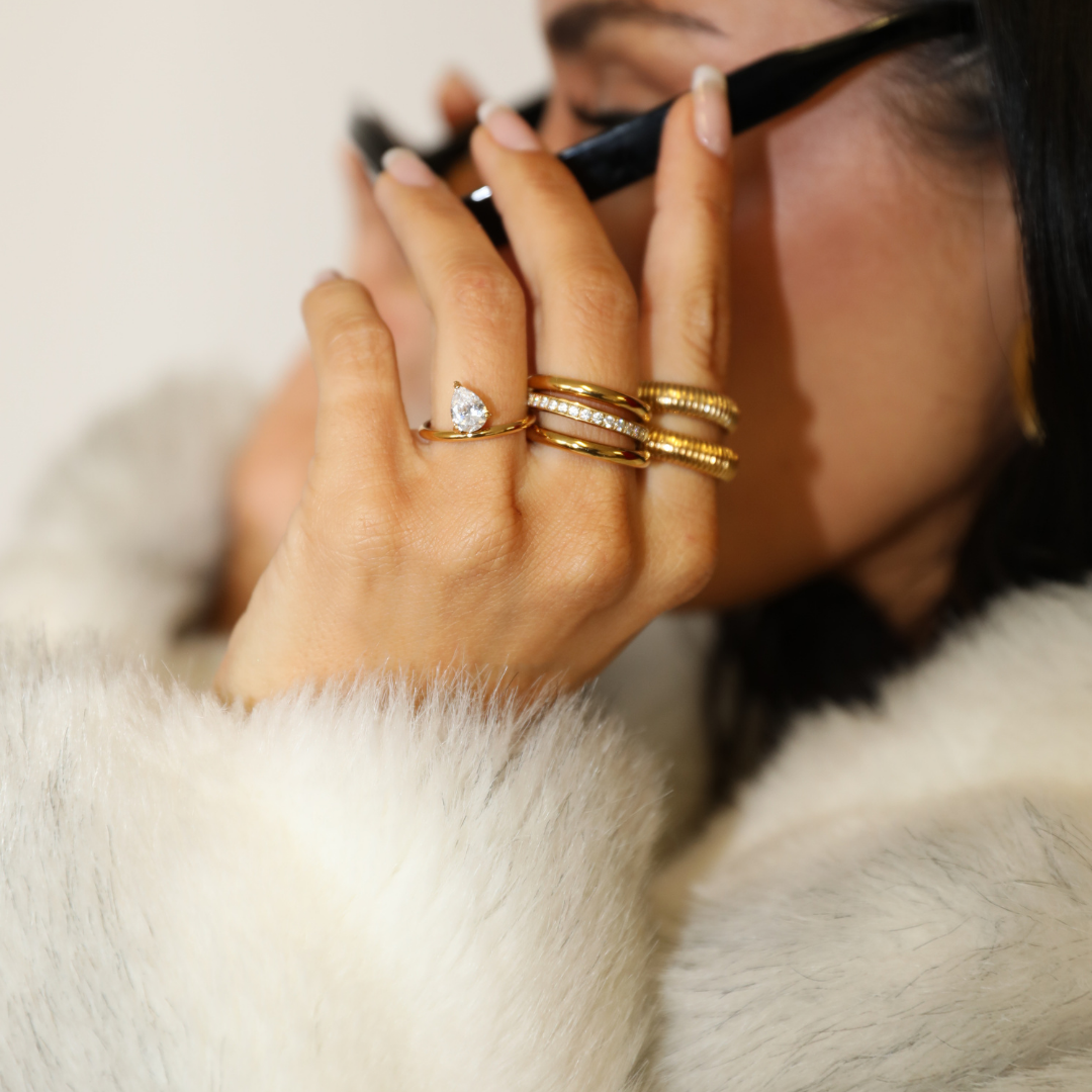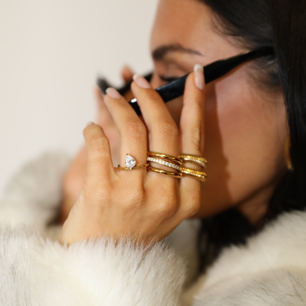 The Maeve Ring is a classic gold band set with an angled pear-cut CZ crystal for a clean, elongated shine. Available in sizes 6–8, it’s tarnish-free, waterproof, and hypoallergenic, and backed by our lifetime guarantee, including replacement if it ever tarnishes or loses stone integrity.